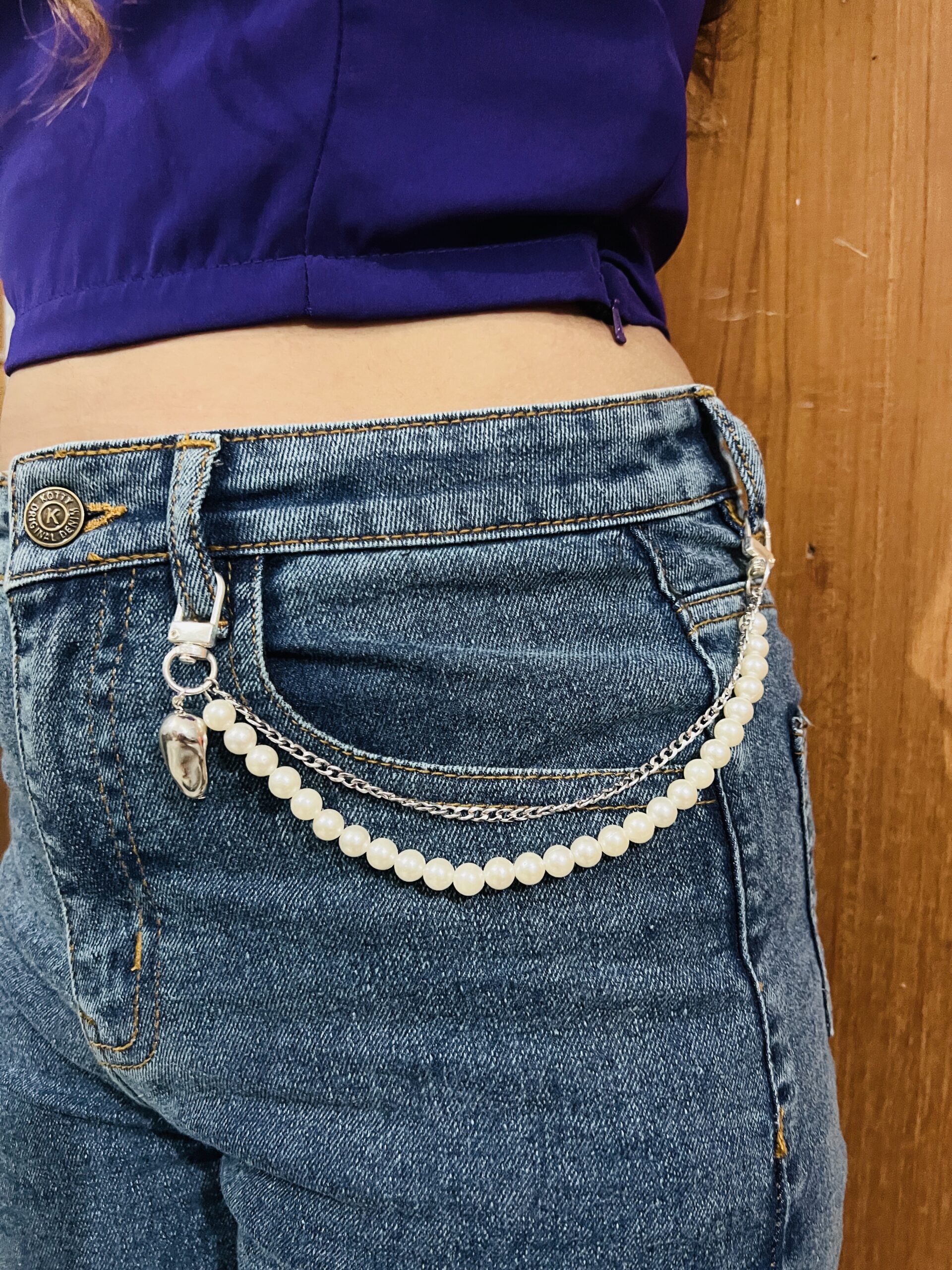 A statement piece that blends elegance with an edgy touch. This pearl chain waist accessory adds a unique charm to your everyday denim looks.