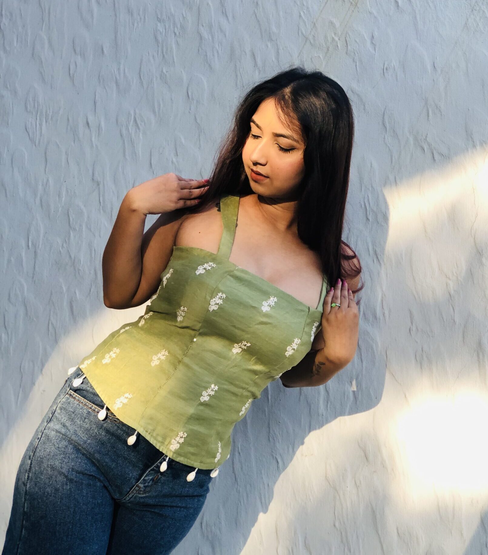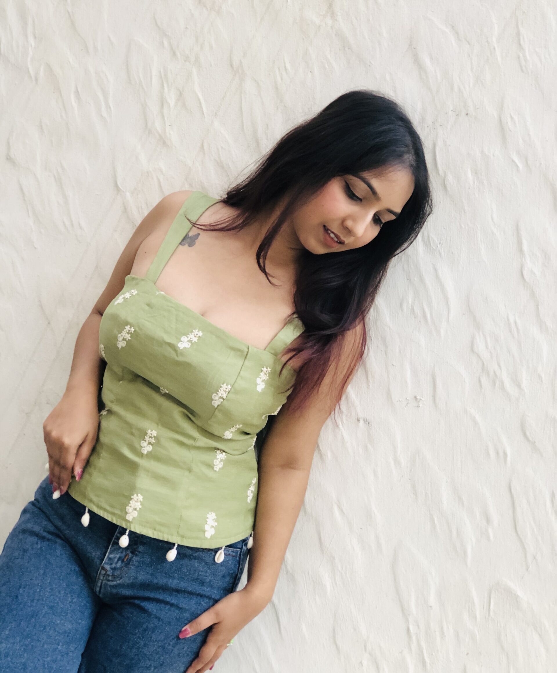 A soft, feminine corset style top designed to bring a touch of elegance to your everyday style. Crafted in a soothing sage tone with delicate floral detailing, this piece feels fresh, minimal, and effortlessly pretty.